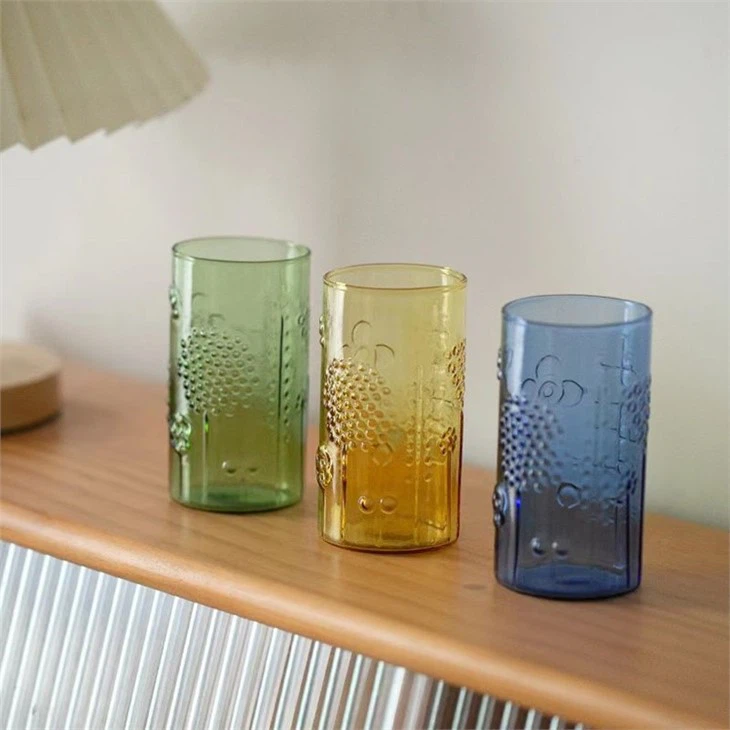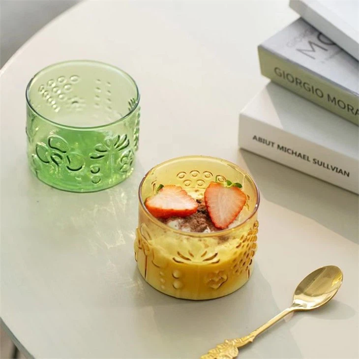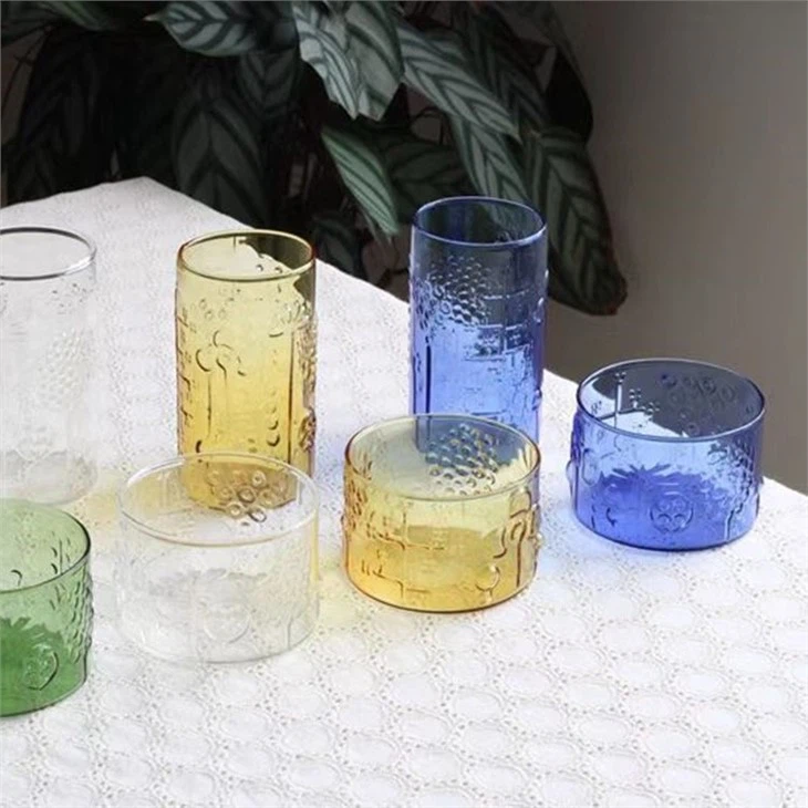 Os copos de vidro colorido estão disponíveis em dois estilos, um com diâmetro de 6 cm, altura de 11 cm e capacidade de 230 ml. Um deles tem diâmetro de 8 cm, altura de 6 cm e capacidade de 230 ml. Existem quatro cores, nomeadamente verde, âmbar, azul e cinza. O copo é feito de vidro cru para que não desbote e desbote com o uso. INTOWALK é o fornecedor fonte de produtos de vidro na China.
