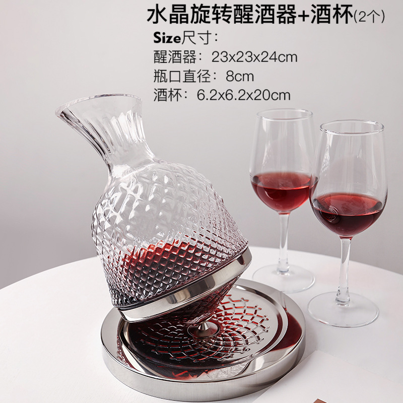 Marca: INTOWALK Nome do produto: decantador giratório de vidro cristal Estilo: simplicidade moderna, luxo leve Material do produto: vidro cristal + metal Tamanho: Diâmetro 8cm. Altura 24cm. Diâmetro inferior + placa 23cm descrição detalhada: Design do bico: processo de corte a frio, derramamento suave e redondo de vinho Cristalino: Restaure a verdadeira cor do vinho fino, seu brilho cristalino permanece novo e durável Design de base: base de aço inoxidável, fundo giratório livre de 360°, belo design de pino de disparo